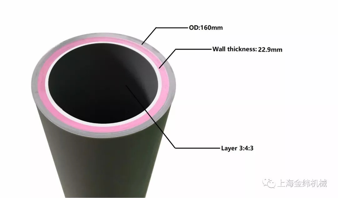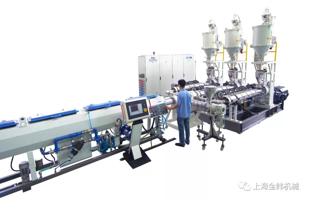 Recently, JWELLMachinery's PPR/FR-PP Pipe Extrusion Line which manufactured for Americancustomer enterprise, has been runningsuccessfully in the factory of SHANGHAI JWELL MACHINERY. The trail run is very successful.The operation of the production line is extremely stable and smooth,have madepipe products with uniform color,bright and clean surface and stratifiedprecision.1) Manufacturedat low temperature and high speed through special process and equipment usingmulti-layer co-extrusion. 2) Specialscrew design against PPR/FR-PP pipe material. 3) Advancedand Patented extrusion die head design against PPR/FR-PP pipes. 4) Precisecontrol of thickness and layering of pipes. 5) Advancedautomatic water supply and drainage control and circulating water temperaturecontrol. The cooling effect is good. The maximum line speed is up to 20M/min. 6) Theextrusion line is designed to operate automatically which guarantee reliableand safe. 7) Thelayout of multiple extruders is reasonable and the space occupied is small. 8)  Thethickness of the product can reach 160 SDR7.4.  Pipe Features&Application1、Pipe Features&Application   1) PPR/FR-PP pipe is widely used in solarenergy, thermal energy circulation system, heating system and water supplybecause of its higher pressure and temperature resistance, long operationallife span, high strength and impact resistance, and the prevention of pipelinesagging. 2) Because of its high strength, PPR/FR-PPpipe can save a lot of engineering costs, and security is greatly guaranteed.Therefore, PPR/FR-PP now has the tendency to replace PPR. It is a masterpieceof plastic pipes in the new era.