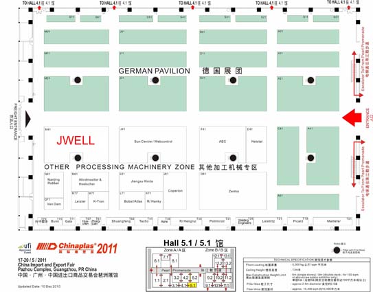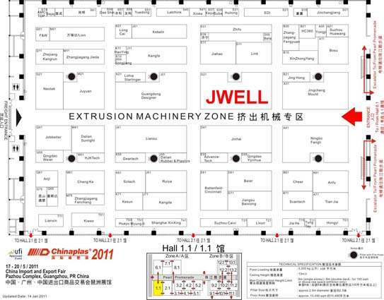 Chinaplas 2011(The 25th International Exhibition on Plastics and Rubber Industries) will be hold in Pazhou Complex ofGuangzhou city, South of China from May 17 to 20.This time our company Shanghai Jwell Extrusion machinery co., Ltd will carry kinds of machinery and equipments to show in the exhibition, such as: horizontal double-wall corrugated pipe forming machine, 1600mm vacuum tank, plastic extruder, glaze tile forming machine, blow molding machine, three-roller calender system, T-die, roller, crusher, recycling machine, screw and barrel etc. We have two big booths which are located in Hall 1.1 booth number D21 and Hall 5.1 booth number M41.Welcome to our Booth.